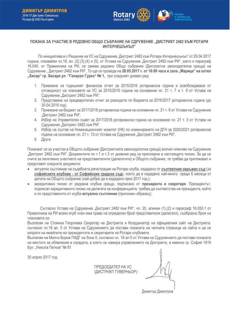 За мен и за Ротари клубовете от VIII-ма зона като домакини, ще е радост вашето участие в 10-та годишната конференция на Ротари Дистрикт 2482 България. Каним всички членове на Ротари, Ротаракт и Интеракт клубовете от Дистрикта и техните семейства.
