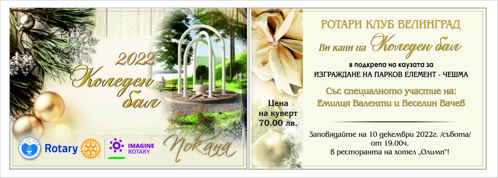 Дата: 10/12/2022Ротари Клуб Велинград Ви кани на традиционния Коледен бал на 10 декември 2022 година.