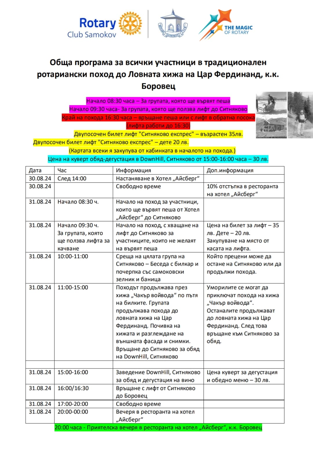 Ротари клуб Самоков, кани всички приятели и ротарианци на традиционен приятелски поход до Ловната хижа на Цар Фердинанд, к.к. Боровец на 31 август!