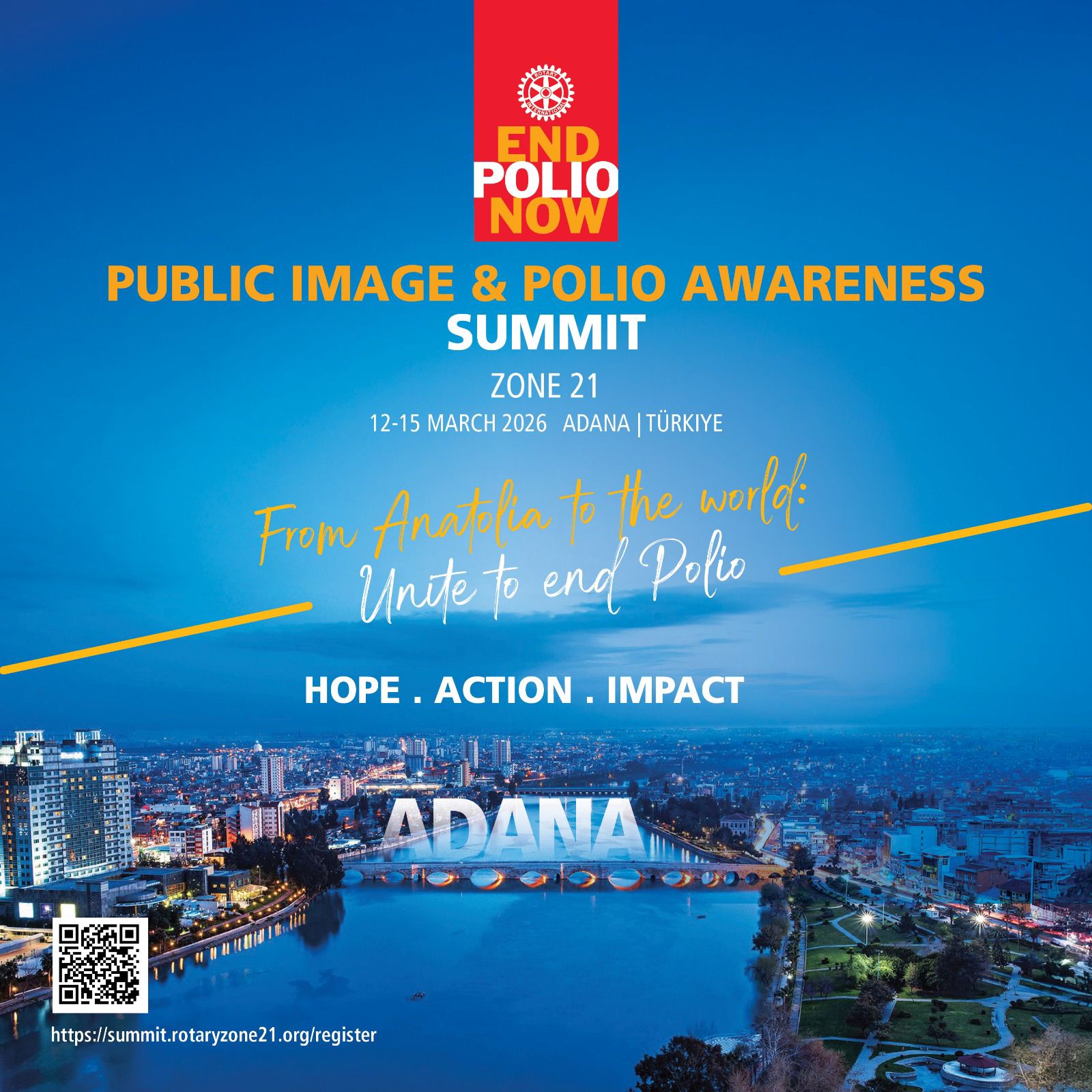 С голямо удоволствие Ви каним на Регионалната среща на Ротари – Зона 21, посветена на полиомиелита и публичния имидж, международен форум, насочен към утвърждаване на водещата роля на Ротари в последната решителна фаза от нашата голяма цел - свят без полиомиелит. Това важно събитие ще се проведе в периода 12–15 март 2026 г. в Адана, Турция и се организира съвместно от Координационния екип на EndPolioNow на Зона 21 и Екипа по публичен имидж на Зона 21.