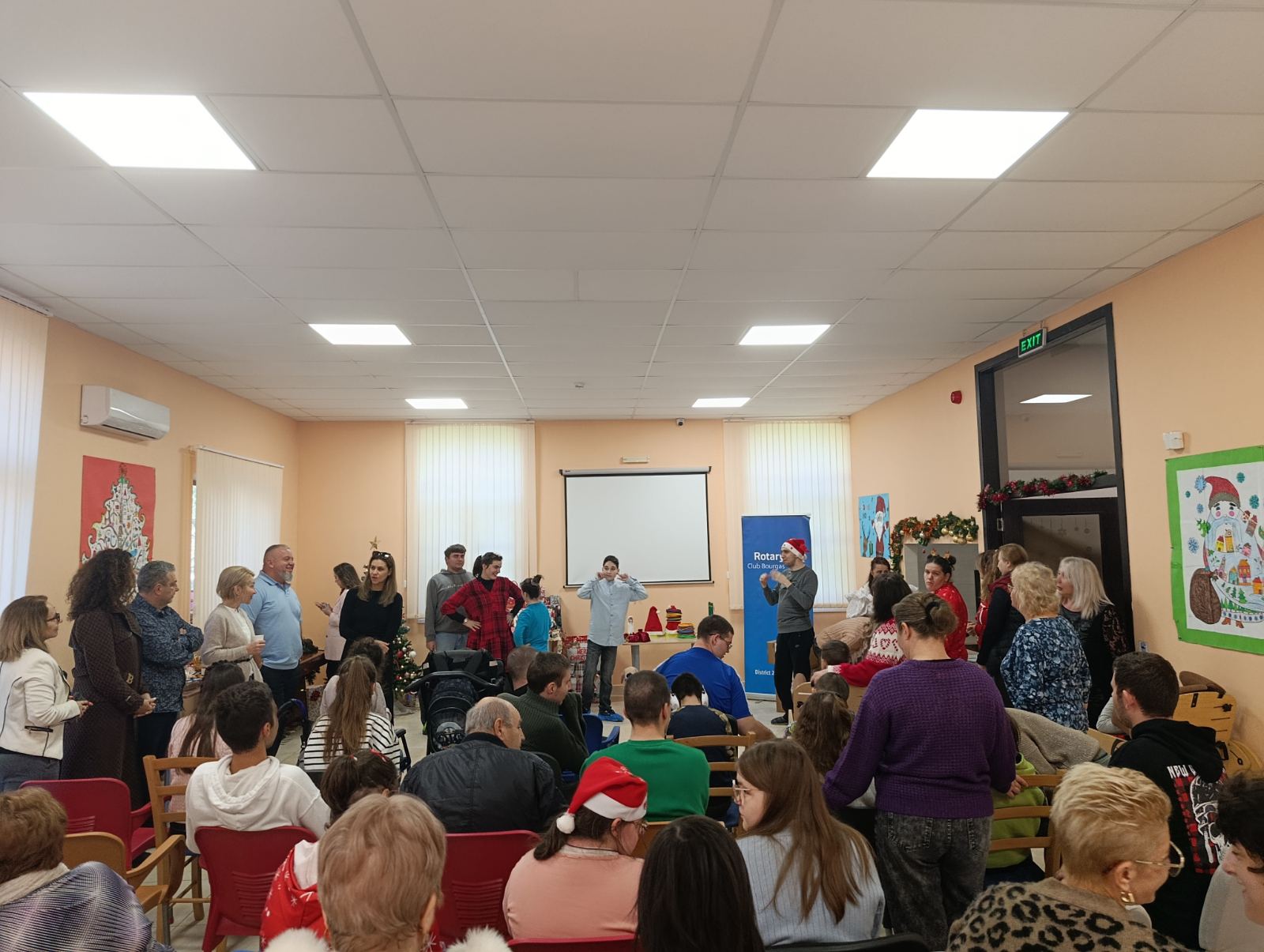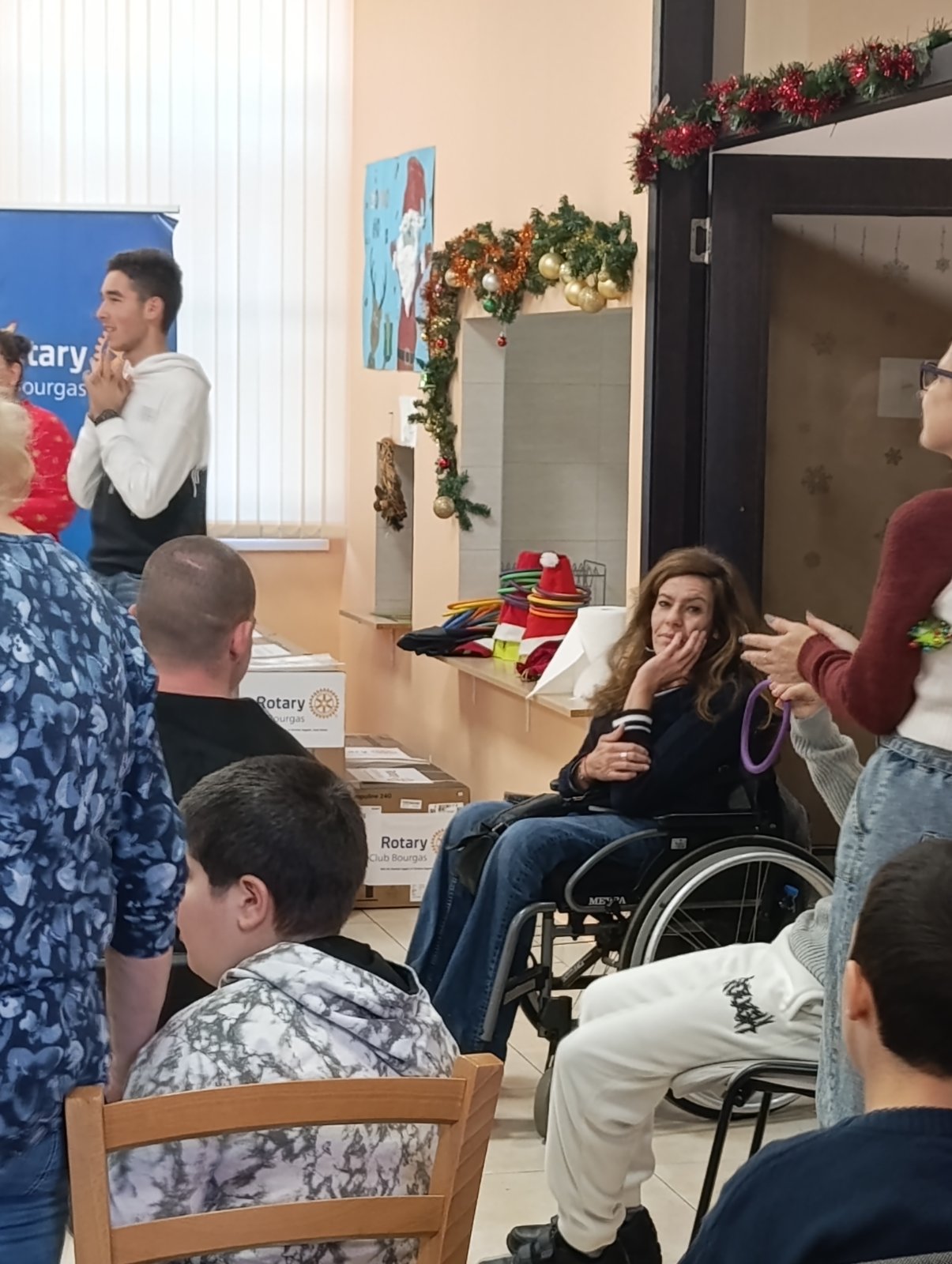 В едната си посока, проектът подкрепя „Дневен център за деца и/или пълнолетни лица с тежки множествени увреждания“, в който се запознахме с екип от професионалисти, които спечелиха възхищението ни с отдадеността си към ежедневната грижа за деца и младежи със специални потребности. Предоставихме голяморазмерен и защитен с предпазна мрежа батут, стъпки от пяна за сензорна стимулация при ходене, сензорна пътека за подобряване на баланса и бягаща пътека за подобряване на мускулната сила, тонус и функционална координация – всичко заявено за разширяване на рехабилитационните възможности за двигателно развитие. Предстои изграждането на външен пясъчник с навес за подходящи занимания на открито. Освен че оборудването насърчава движението и повишава ефективността и разнообразява работа за напредъка на тези деца и младежи, то ще продължава да ги радва, мотивира и подобрява тяхната увереност. Официалното му предоставяне съвпадна с празничните дни около Коледа и стана особено вълнуващ за всички. Сред смях, вълнение и благодарност, всички присъстващи – родители, екип и ротарианци – споделиха усещането, че правим нещо истински значимо.